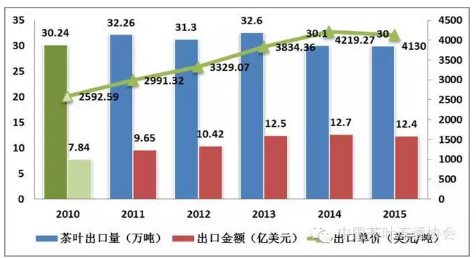 圖9 2010-2015年我國(guó)茶葉出口量、總金額、單價(jià)走勢(shì)變化