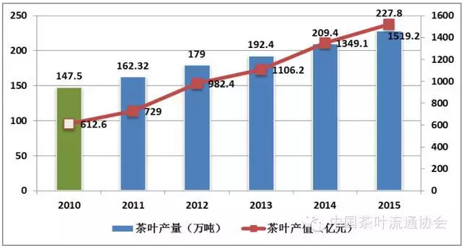 “十二五”期間,面對(duì)復(fù)雜的國(guó)內(nèi)外經(jīng)濟(jì)形勢(shì),我國(guó)茶葉產(chǎn)業(yè)在生產(chǎn)成本持續(xù)上漲、市場(chǎng)需求不斷升級(jí)的雙重挑戰(zhàn)下,依然展現(xiàn)出蓬勃生機(jī)和活力,各項(xiàng)經(jīng)濟(jì)指標(biāo)均持續(xù)穩(wěn)步增長(zhǎng)。截至2015年末,全國(guó)(18個(gè)產(chǎn)茶省)茶園面積擴(kuò)增至4316萬(wàn)畝,其中采摘面積3387萬(wàn)畝,投產(chǎn)率達(dá)78.5%。茶葉總產(chǎn)量增加至227.8萬(wàn)噸,農(nóng)業(yè)產(chǎn)值達(dá)到1519.2億元。六大茶類(lèi)普遍量?jī)r(jià)齊增,茶類(lèi)結(jié)構(gòu)進(jìn)一步優(yōu)化。茶葉內(nèi)銷(xiāo)量預(yù)計(jì)達(dá)到172萬(wàn)噸,銷(xiāo)售額約為1580億元。茶葉出口量繼續(xù)保持在30萬(wàn)噸左右,出口金額上漲至12億美元,出口單價(jià)超過(guò)4000美元/噸。產(chǎn)業(yè)布局漸趨合理,技術(shù)創(chuàng)新、產(chǎn)品創(chuàng)新和服務(wù)創(chuàng)新意識(shí)不斷提升,淘汰落后產(chǎn)能和產(chǎn)業(yè)結(jié)構(gòu)重組步伐加快,為持續(xù)推進(jìn)產(chǎn)業(yè)轉(zhuǎn)型升級(jí),謀求經(jīng)濟(jì)新常態(tài)下的產(chǎn)業(yè)新空間拓展奠定了良好基礎(chǔ)。